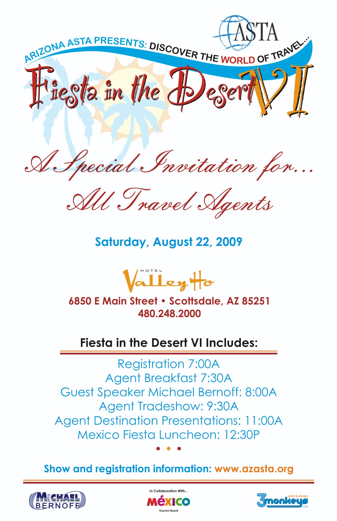 We would like to invite you to participate in the 6th Annual Fiesta in the Desert VI Travel Industry Travel Agent Fiesta and Tradeshow on Saturday, August 22nd, 2009. The event will be held at the Hotel Valley Ho, located in Scottsdale, Arizona. Watch your email for additional details and registration information.